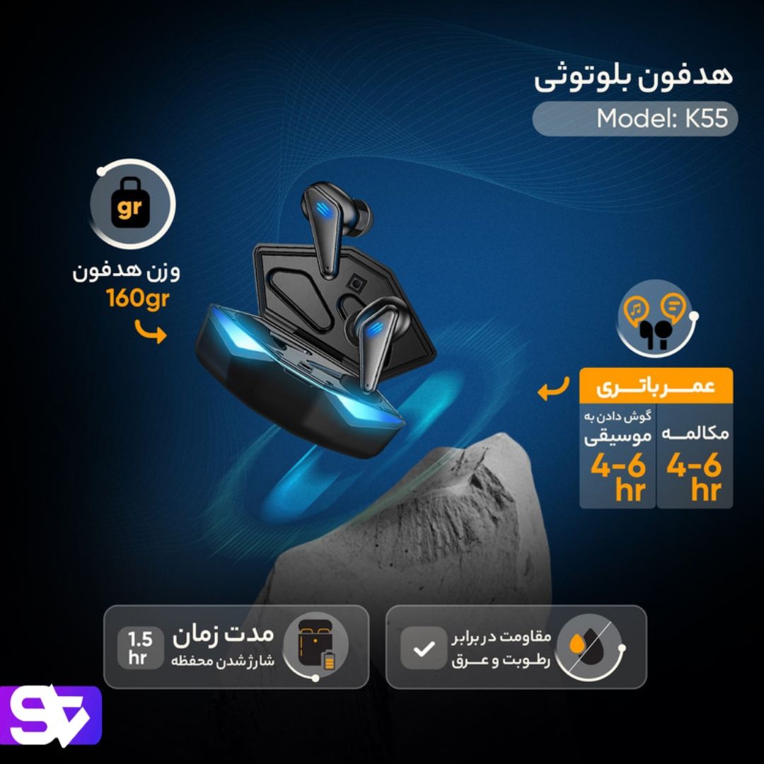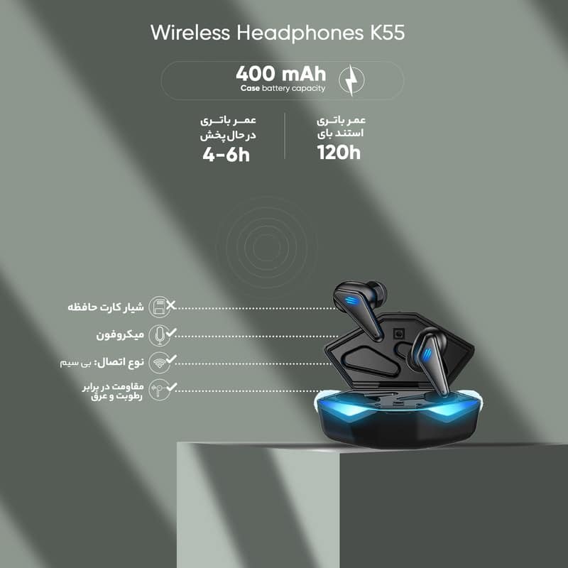 ایرپاد K55 (اصل-مشکی) یک هندزفری بیسیم گیمینگ و ورزشی است که به خاطر طراحی ارگونومیک، کیفیت صدا، و امکانات مقاومتی مورد توجه قرار گرفته است.مشخصات فنی و امکانات اصلی– نسخه بلوتوث: 5.4 با محدوده عملکرد تا ۱۰ متر.– ظرفیت باتری خود هندزفری: 400 میلیآمپر ساعت، امکان پخش موسیقی یا مکالمه تا 4 تا 6 ساعت با هر بار شارژ.– ظرفیت باتری کیس شارژ: تا 200 ساعت استندبای یا امکان سه بار شارژ کامل هندزفریها.– مدت زمان شارژ: هندزفریها 1 ساعت، کیس شارژ 1.5 ساعت نیاز دارد.– وزن: 160 گرم که استفاده طولانیمدت را راحت میکند.### ویژگیهای ظاهری و ارگونومی– رنگ مشکی مات و ظاهر اسپرت با کیس شارژر خاص.– کنترل لمسی روی هر گوشی با عملکرد سهحالته برای مدیریت موسیقی، مکالمه و حالت بازی.– طراحی برای استفاده روزمره، ورزش و گیمینگ، مقاوم در برابر رطوبت و عرق (استاندارد IPX4).صدا و میکروفون– صدای HIFI با وضوح بالا، بیس قوی و حالت اکولایزر مطلوب.– میکروفون داخلی با کیفیت برای مکالمه شفاف در محیطهای مختلف.– سریهای ژلهای (واشرها) در دو سایز برای کاهش نویز محیط و راحتی بیشتر. اقلام همراه و سایر قابلیتها– اقلام موجود: دو جفت واشر سر گوشی، کابل شارژ USB-C، دفترچه راهنما، و کیس شارژر.– مناسب برای اندروید و iOS، اتصال آسان و پایدار.– قابلیت تعویض دستگاه در صورت خرابی تا ۷ روز ایرپاد K55 انتخابی مناسب برای کاربران پرتحرک، گیمرها و کسانی است که به صدای با کیفیت و راحتی اهمیت میدهند. این مدل با وزن کم، مقاومت در برابر عرق و رطوبت و شارژدهی مطلوب، جزو محصولات پرطرفدار بازار هندزفری بیسیم است.